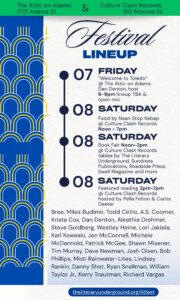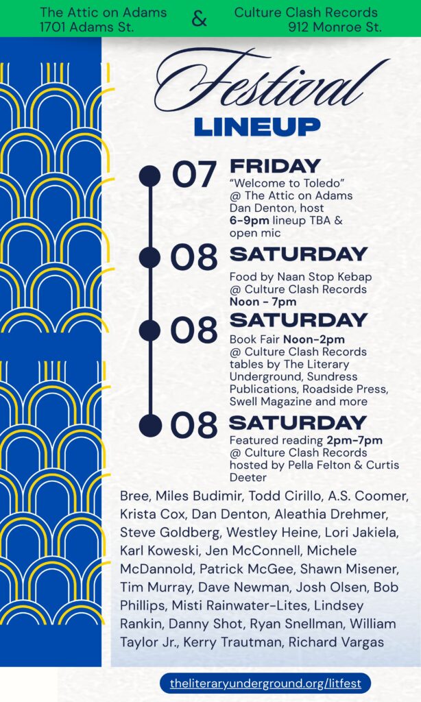 Lineup for the Saturday reading: Bree, Miles Budimir, Todd Cirillo, A.S. Coomer, Krista Cox, Dan Denton, Aleathia Drehmer, Steve Goldberg, Westley Heine, Lori Jakiela, Karl Koweski, Jen McConnell, Michele McDannold, Patrick McGee, Shawn Misener, Tim Murray, Dave Newman, Josh Olsen, Bob Phillips, Misti Rainwater-Lites, Lindsey Rankin, Danny Shot, Ryan Snellman, William Taylor Jr., Kerry Trautman, Richard Vargas